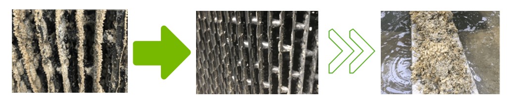經過物理式除垢盾處理後的冷卻水塔散熱鰭片水垢, 自動剝落於盛水盤中, 效果顯著。