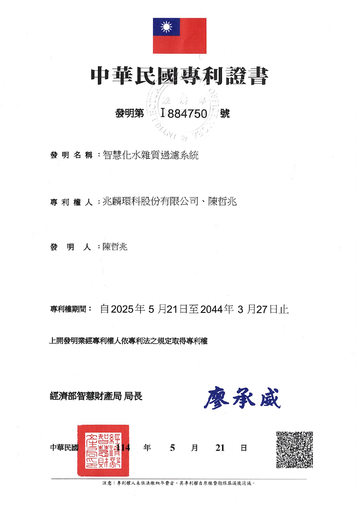 兆麟環科開發設計智慧化水雜質過濾系統, 已獲得新型專利