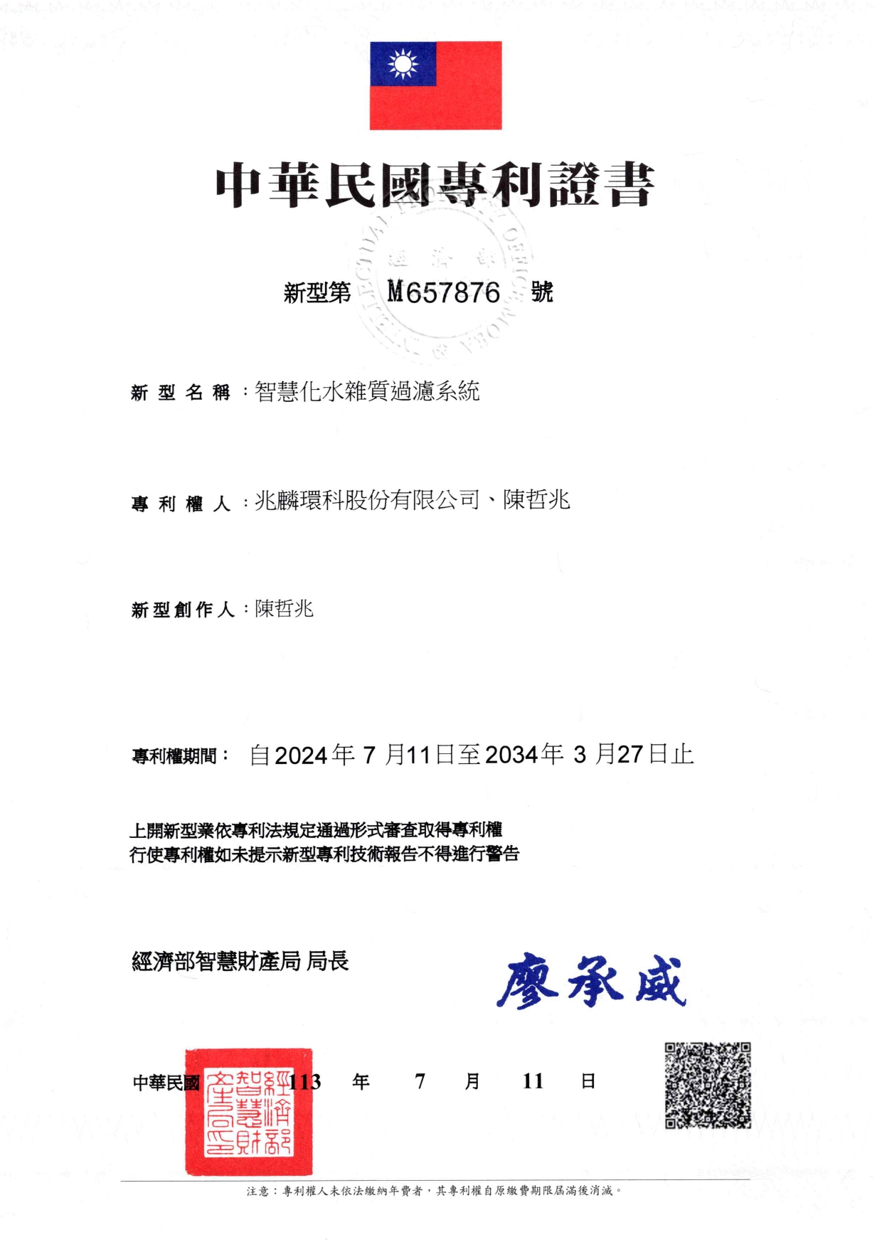 兆麟環科開發設計智慧化水雜質過濾系統, 已獲得新型專利